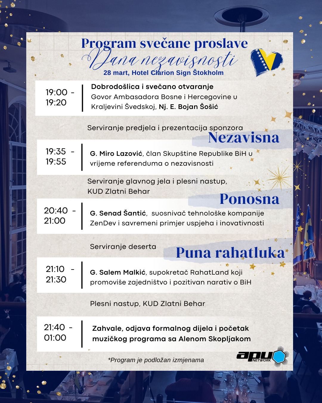 Oblježavanje ovog bitnog datuma APU Network organizuje 28.03.2026., a u nastavku donosimo više detalja svečanosti koju pripremamo povodom Dana nezavisnosti!